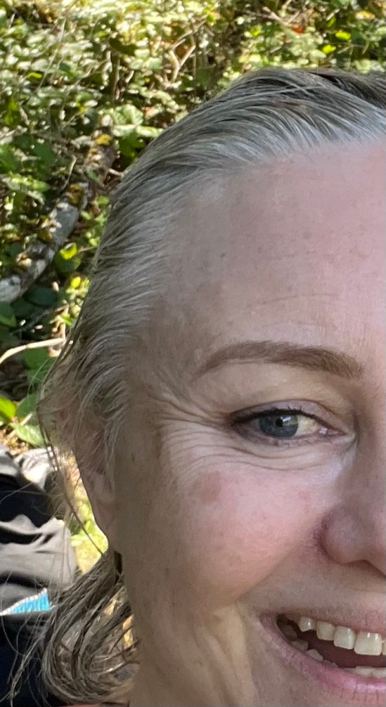 In the picture above, I offer you a close up of me three years ago, after a swim and without a lick on makeup (yikes!). You can see the hyperpigmentation on my cheek, and this is some years after the laser treatment.